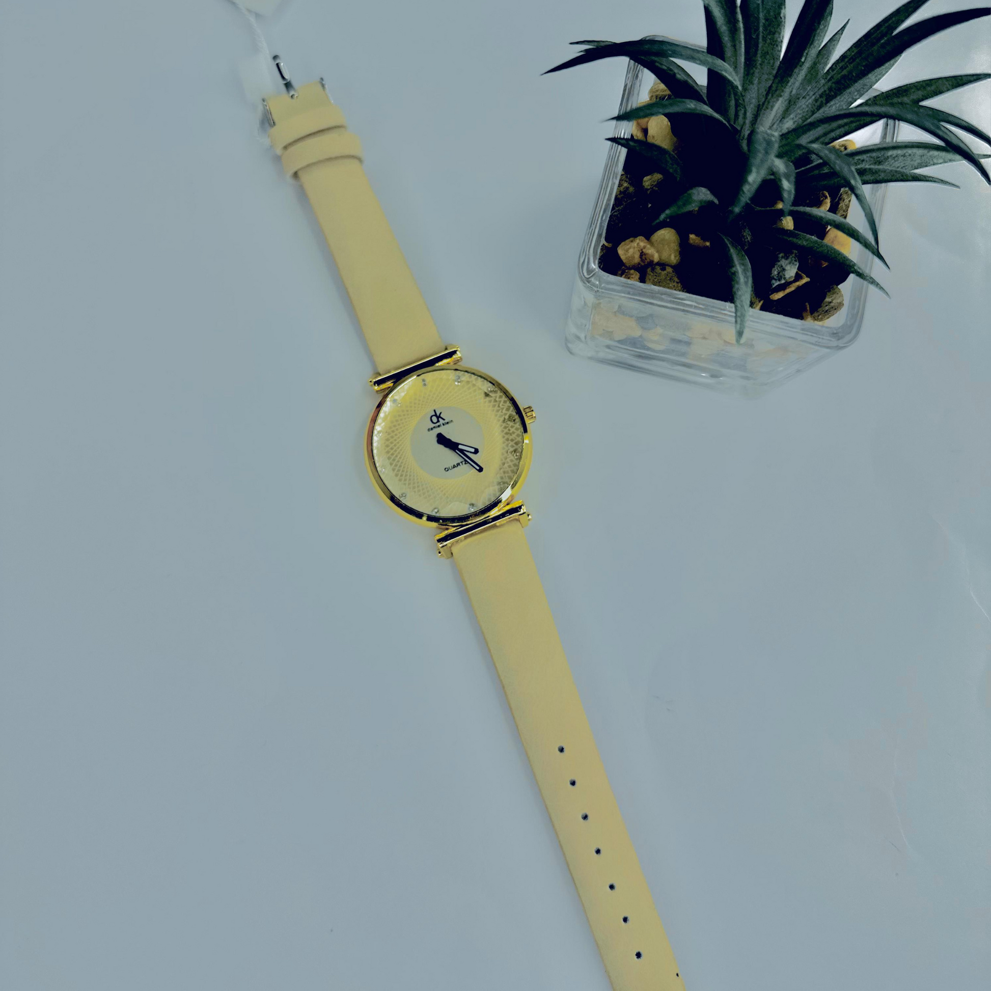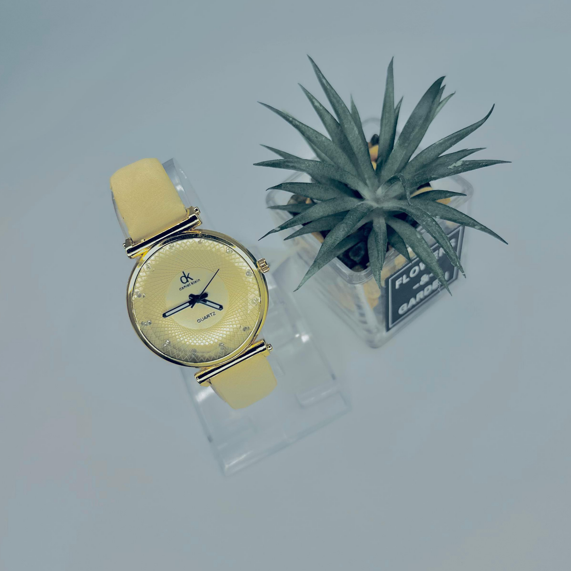 “Calvin Klein ladies’ watch with a sleek skin-colored dial and leather strap – elegant, timeless, and versatile.
