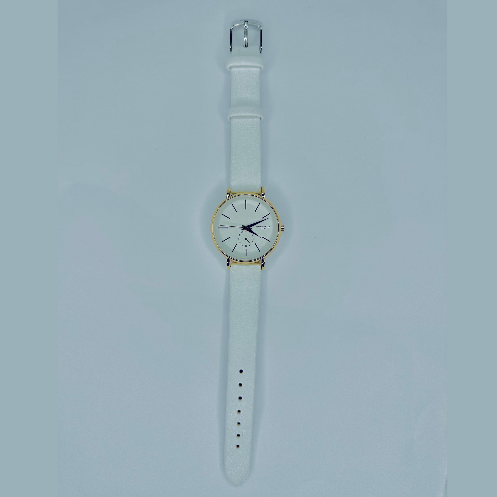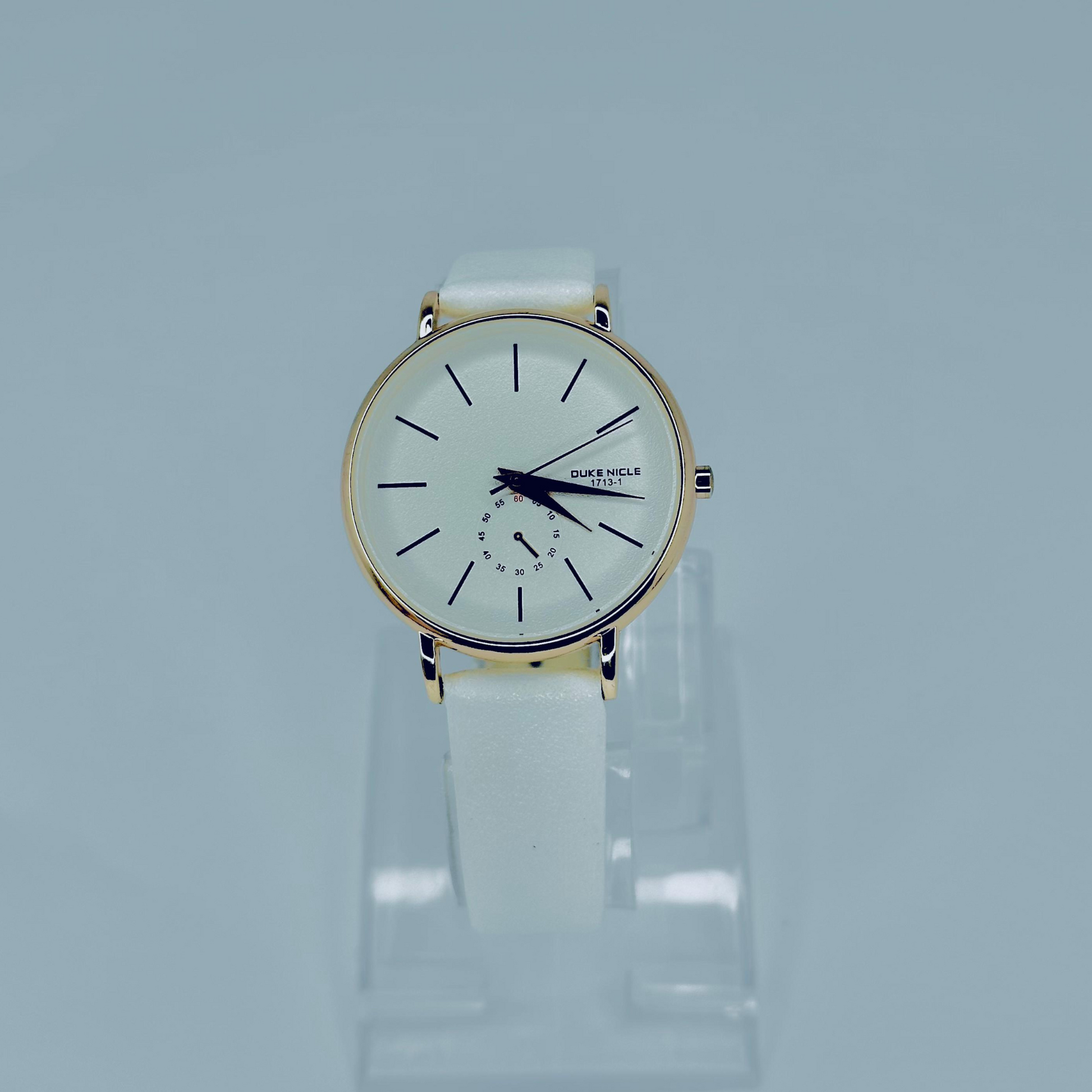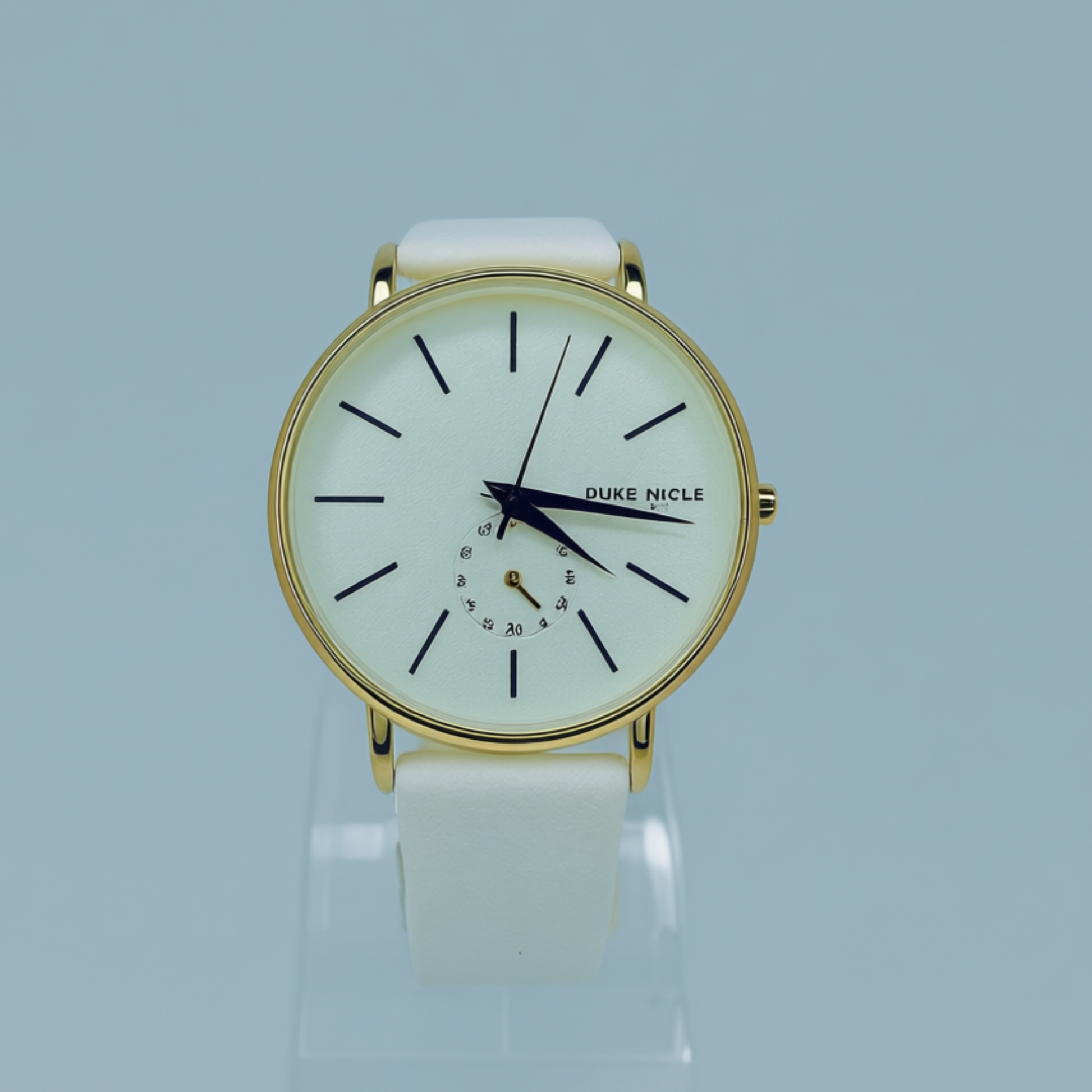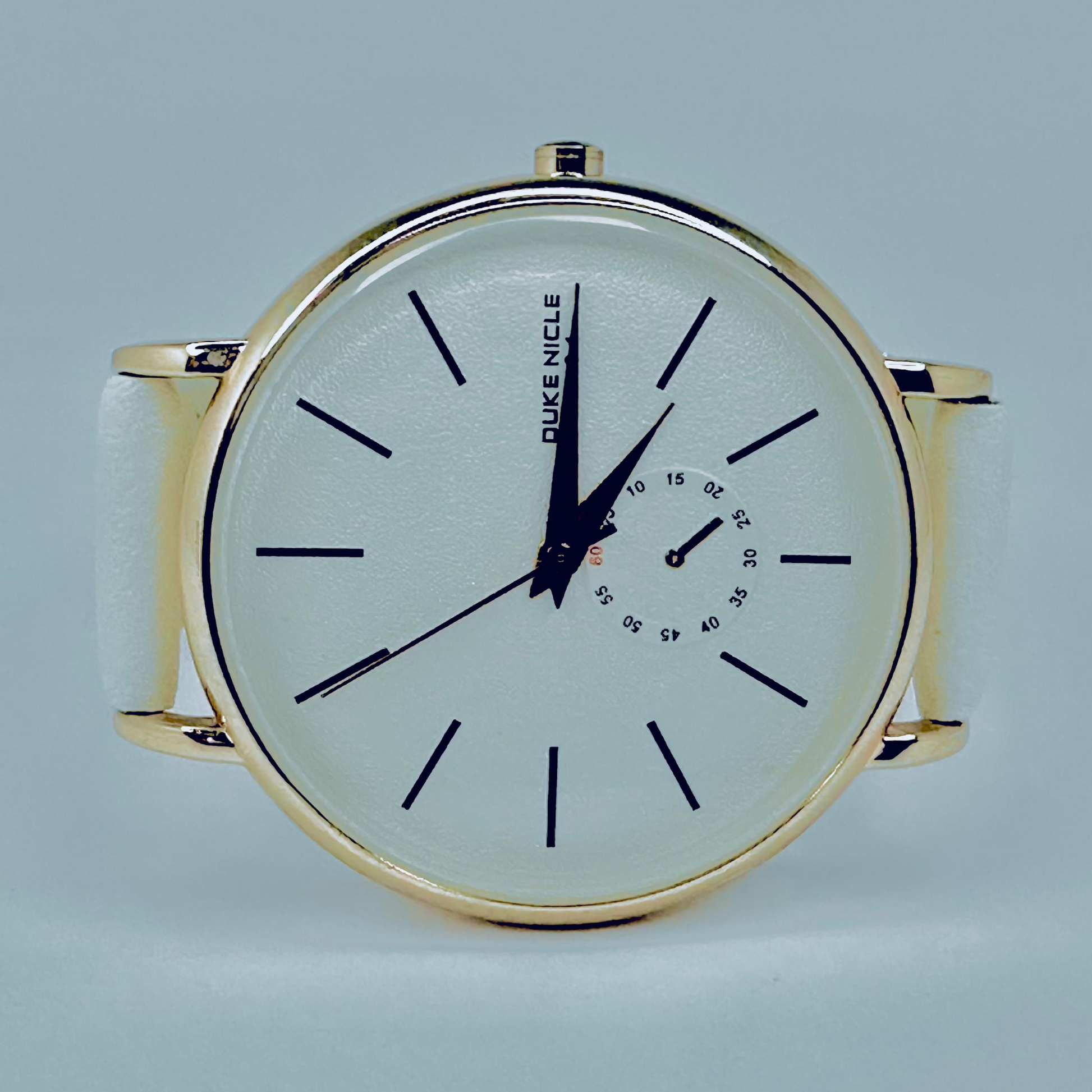 The Duke Nicle analog watch combines elegance and simplicity in a timeless design. Featuring a clean white dial with minimalist black markers and a sleek white leather strap, this watch is crafted to complement both casual outfits and formal attire. Its lightweight build and comfortable fit make it perfect for everyday wear.