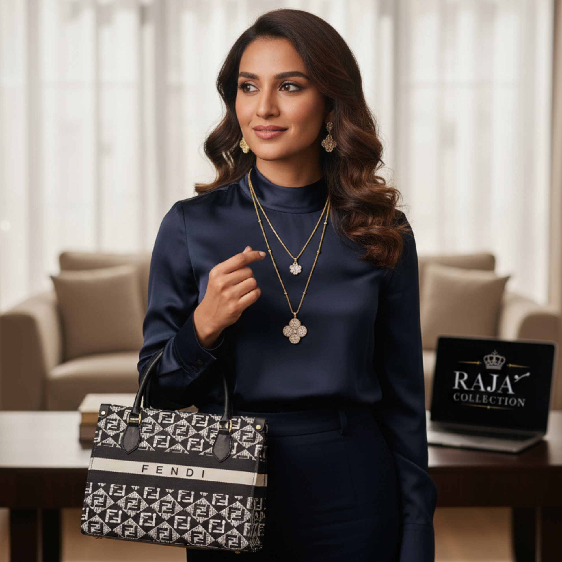 This stylish Fendi tote bag features a bold black and white geometric pattern with the iconic Fendi logo design. Crafted with sturdy handles and a spacious interior, it’s perfect for both everyday use and a chic statement look.